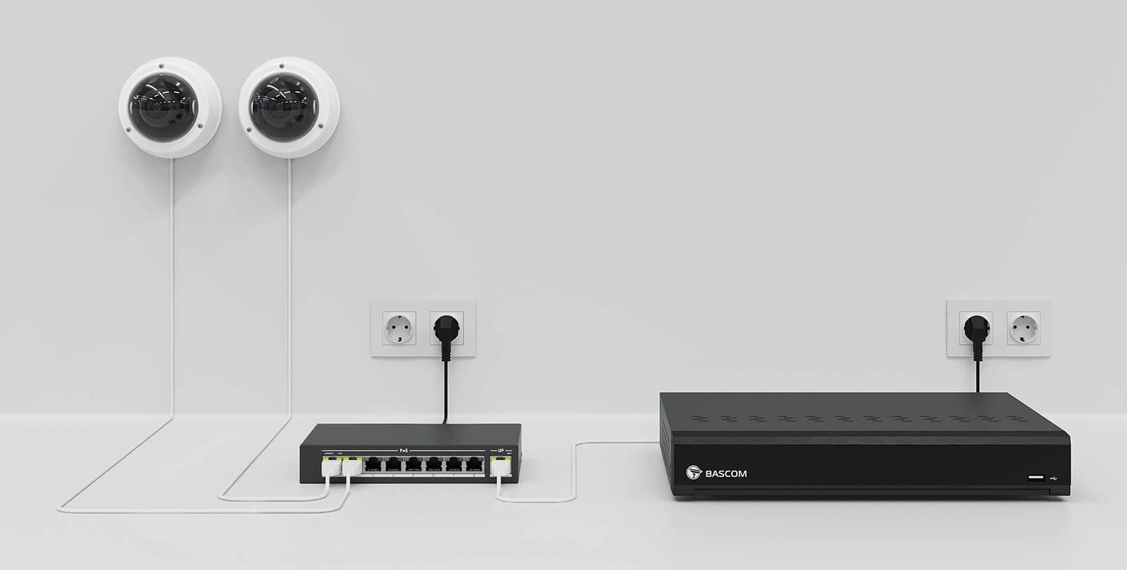 Dans un système de vidéosurveillance câblé, les caméras sont généralement reliées directement à l’enregistreur. Pour les installations plus vastes, l’utilisation d’un commutateur PoE (PoE switch) peut toutefois s’avérer plus efficace – notamment lorsque plusieurs caméras sont éloignées de l’enregistreur. Il suffit alors de connecter toutes ces caméras au switch, puis de tirer un seul câble vers l’enregistreur.