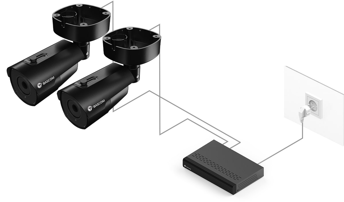 95 % de nos clients n’avaient jamais installé de système de vidéosurveillance auparavant, mais ont pu installer ce système Bascom eux-mêmes. Fixez les caméras au mur ou au plafond, branchez-les et le système fonctionne.